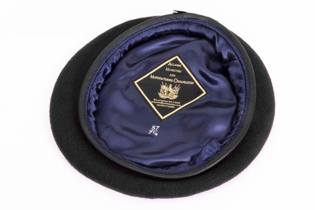 Our approved (Ammo & Company) small crown black berets are made from 100% wool, banded with soft black leather with drawstring and bow, and comes with a mid-blue coloured silk lining. Ammo & Company Ltd are the leading manufacturer of military berets in the UK, with the most comprehensive stocked range available.