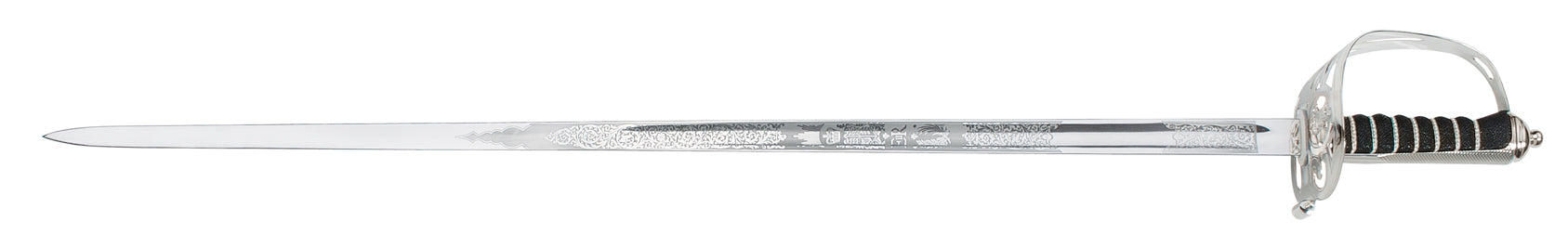 Guard: Pierced steel guard, hand polished and nickel plated. Cap made of brass, which has been nickel plated with regimental crest.