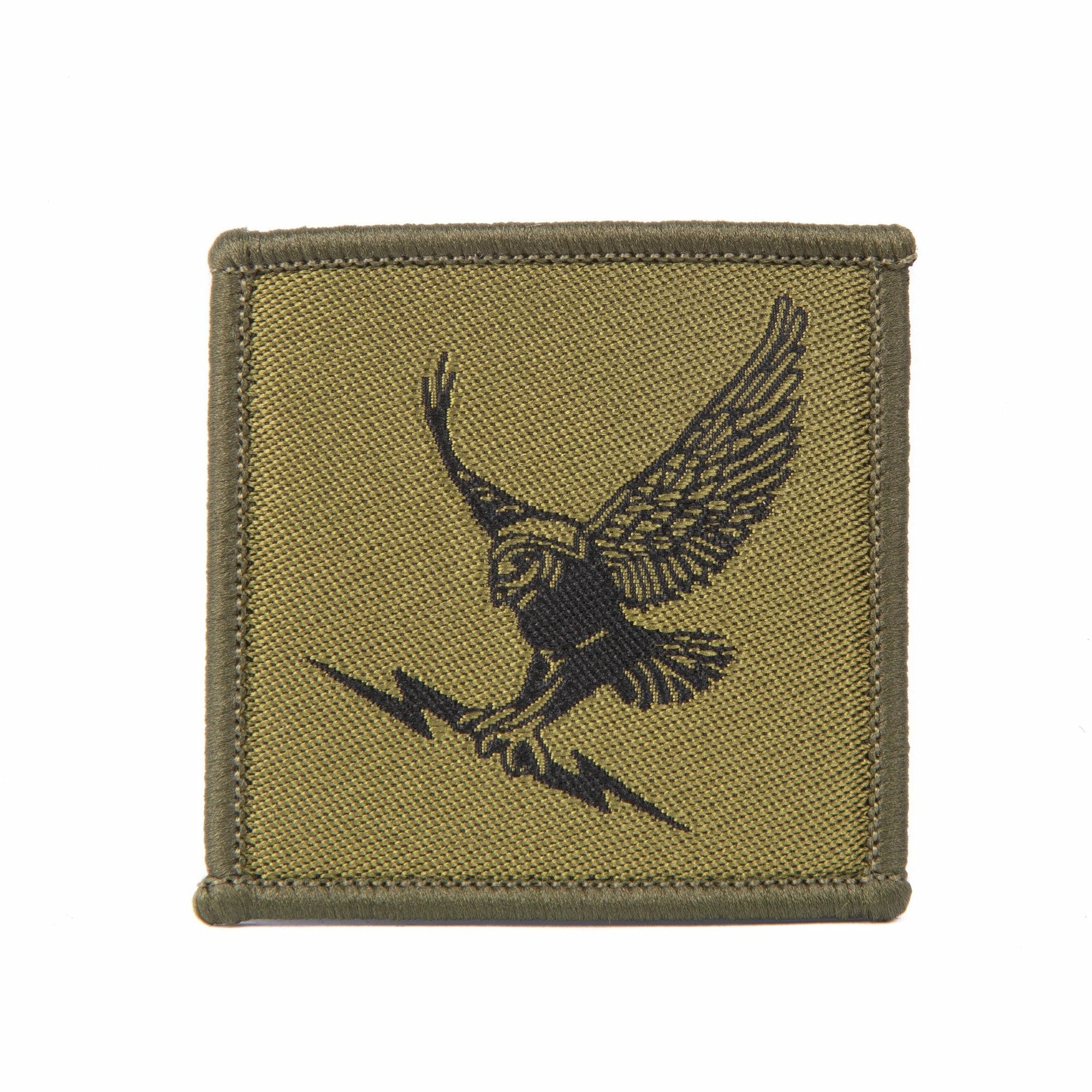 The JHC Owl on lightning bolt is worn on the left sleeve below the Union Flag