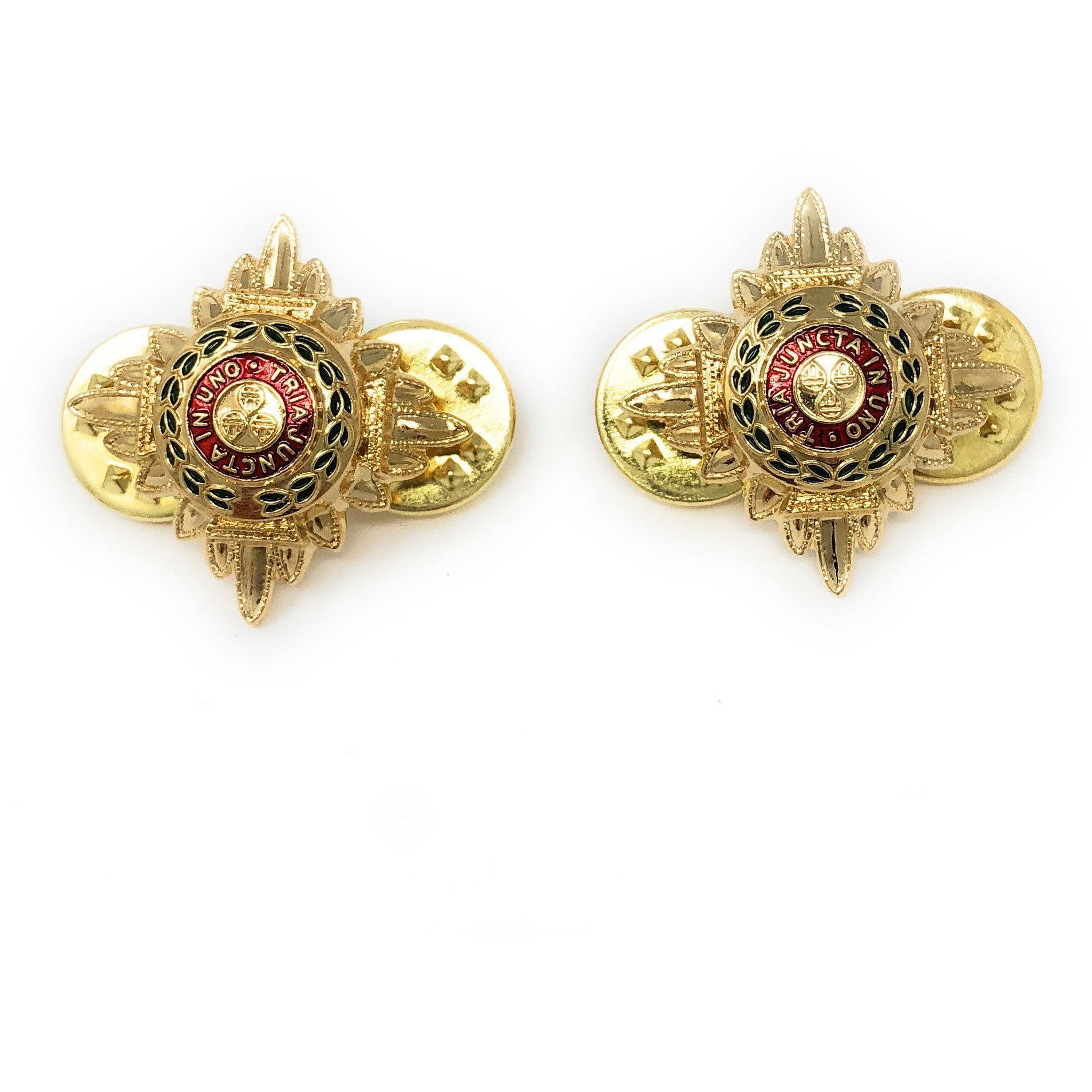 Regulation size and colour Officers' service dress pips. Gold with enamelled centre and spike and clutch fitting.Sold in pairs.